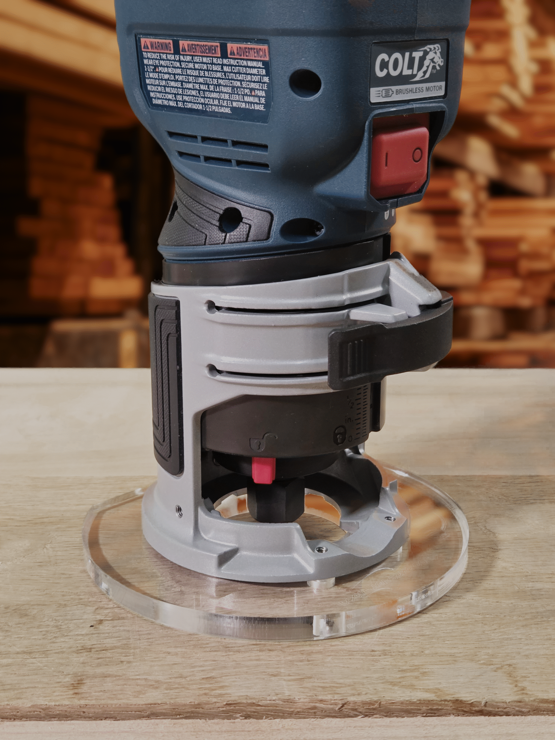 3/8″ Thick 5″ Circle baseplate upgrade with a flat edge with a 2″ opening for Bosch BSGKF18V-25N fixed base router.